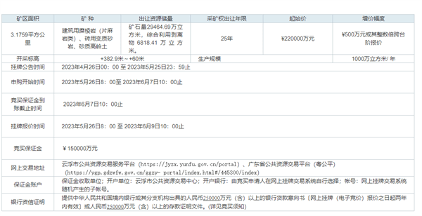 另外,采礦權(quán)出讓礦區(qū)面積3.1759平方公里(4763.84畝),礦區(qū)開采范圍內(nèi)的土地以租賃方式使用。土地的租金、青苗補償款等費用合計人民幣70000萬元,由競得人承擔并在簽訂《非油氣采礦權(quán)出讓合同》后,在2023年7月30日前支付第一期款項人民幣35000萬元到云浮市云城區(qū)財政局指定銀行賬號,第二期在2023年10月30日前繳納剩余款項人民幣35000萬元。云浮市云城區(qū)人民政府負責協(xié)調(diào)完成礦區(qū)范圍(3.1759平方公里)租地后交由采礦權(quán)競得人使用,具體租地情況由競買申請人自行向云浮市云城區(qū)人民政府了解。